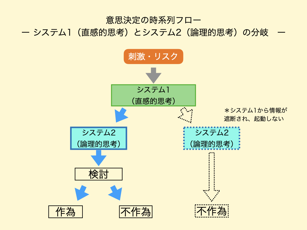 左のフローのように、システム1(直感的思考)が情報をシステム2(論理的思考)に情報を伝えれば、システム2(論理的思考)が検討して選択を行いますが、右のフローでは、システム1(直感的思考)が情報を遮断してシステム2(論理的思考)に情報を伝えない結果、検討そのものが始まらないのです。
