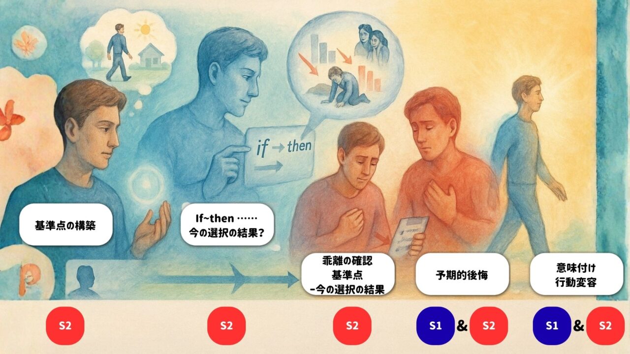 将来の自分のあるべき姿を基準点とし、そこから見た今の自分の選択とその結果を反実思考(仮想)して照らし合わせることで、私たちは「将来、今の自分の選択を後悔しているかもしれない」という感情を今先取りすることができます。